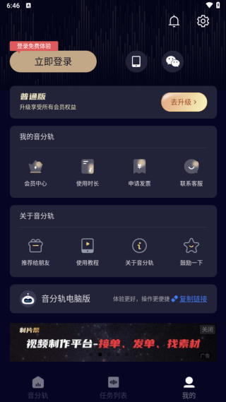 4、进入【我的】页面,可进行会员升级,解锁更多高级功能,体验更全面的音频编辑服务。