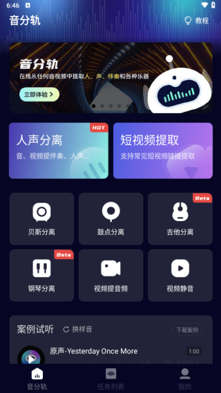 2、登录成功后进入首页,可使用人声分离、短视频音频提取等多种实用功能,轻松完成音频处理。