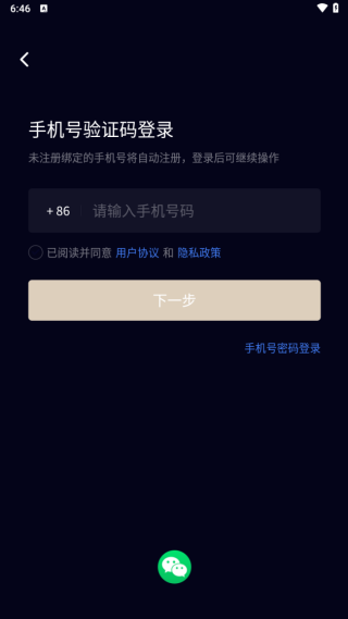 1、打开软件后进入登录界面,输入手机号并填写验证码即可快速注册并登录账号。