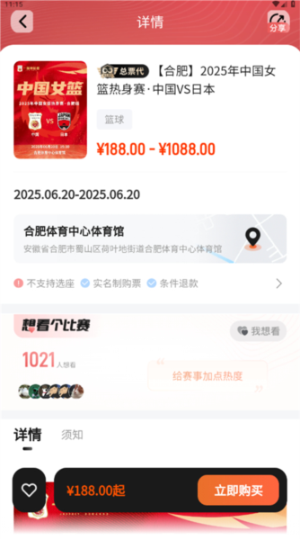 3、以【合肥】2025年中国女篮热身赛·中国VS日本为例,找到对应的赛事页面后即可进入选票阶段。