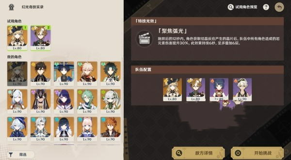 推荐积分倍率选择1倍,选择试用的娜维娅和五郎组成双岩阵容,再加上香菱和班尼特的双火提供增伤。开启特技光效增益期间多使用娜维娅战技+普攻打出岩伤即可。如果对手法和循环不熟悉的话,4人速切,哪里亮了点哪里就能拿满奖励。