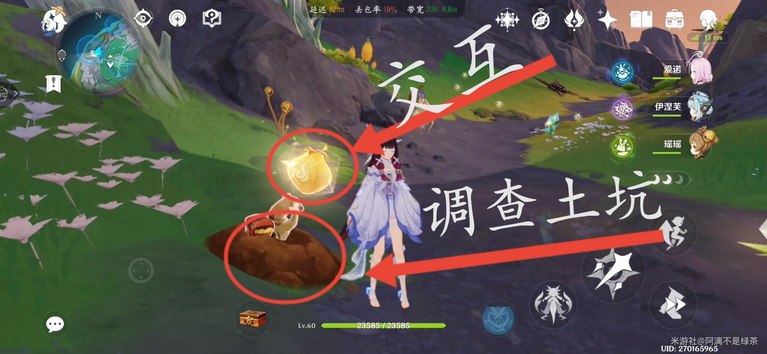 ③:接着顺着山谷往西南方向走,来到山谷的另一头,调查地上的土坑,与鼹鼠举着的月矩漓光团交互