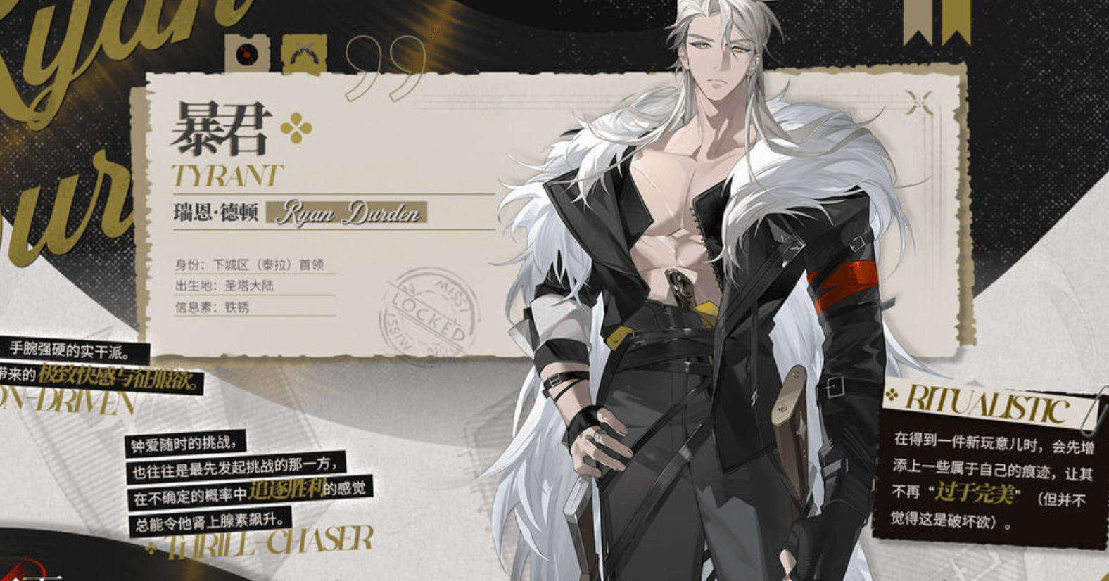 暴君形象给人们的印象就是一种被压倒的感觉。他长相粗犷魁梧,一出场就给人很强的震撼感。他的白发在昏暗的背景之下像夜空中的星星一样十分耀眼。暴君因为长相的缘故而多了一些神秘感,使人很想再去探究一下他的身世和经历。他的气场非常强大,让人生出一种崇敬的感觉,仿佛整个世界都由他来掌控和支配。当暴君出现的时候,周围的空气就会变重,整个空间好像都受他掌控一般,给人一种无形的压力。