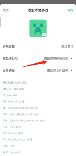 3、输入游戏名称,选择模拟器类型,然后选择文件路径即可。
