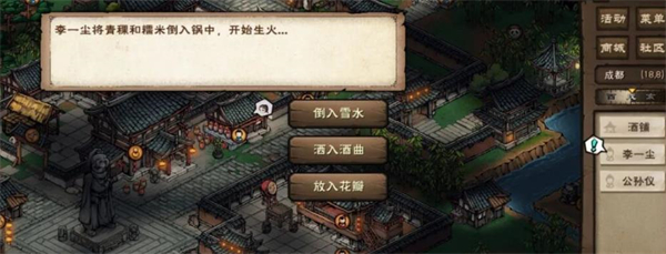 7、选择「倒入雪水」→「再等等」等待冷下来→「放入酒曲」→「放入花瓣」,等待3分钟后原地对话李一尘(18,8)。
