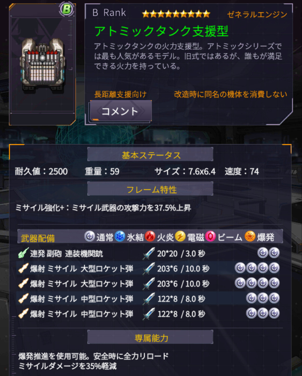 心得:这机体配合伍德是佣兵之王,能力齐射搭配伍德技能,与原能坦克支援型搭配伍德同为疯狂输出手(没暴增增幅器就增加飞弹「爆射」弹夹),而且这个导弹是能追尾的(原能坦克不行),但是打佣兵击倒位时必须持有重击弹,不然体感上原能坦克支援型比较好用(主炮比飞弹短、一旦被拉开距离AI像智障一样不怎么射飞弹,在跑图抓距离……,另一个原能坦克缺点是飞弹没ハインリヒ(海因里希)制御就是随缘射法……)