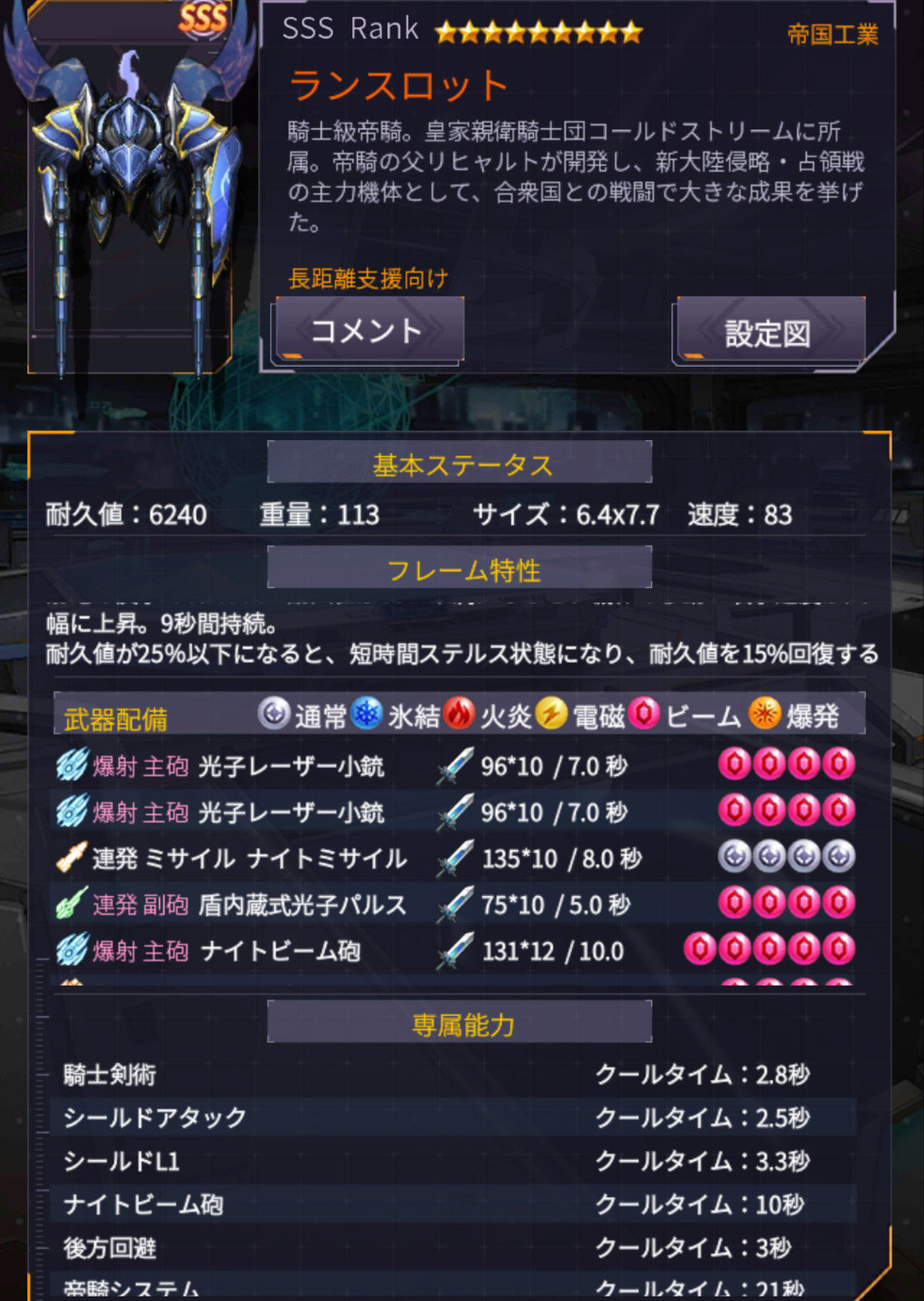 心得:这是我第一台改到八星的S以上级的机体,在输出虽然比不一些机体(部分A机体脆皮),但是二改「动作」多一个帝骑系统,只要启动会瞬间跑到敌人身边进行高速输出(好像是打到弹夹没有),中途打死人还会转移到下一个,除此之外底盘是非常的保命,就算没血建议配个ウッド(伍德)或ベカス(贝卡斯)拖到开下次帝骑,基本上在前期竞技场是像「神」一样的存在,不过SSS级有一台兰斯洛特(主炮机),同样的输出动作可是兰斯洛特可以进行超改,也有人说与其练一样的不如练可以超改的,配件选择「连发」「副炮「ビーム」