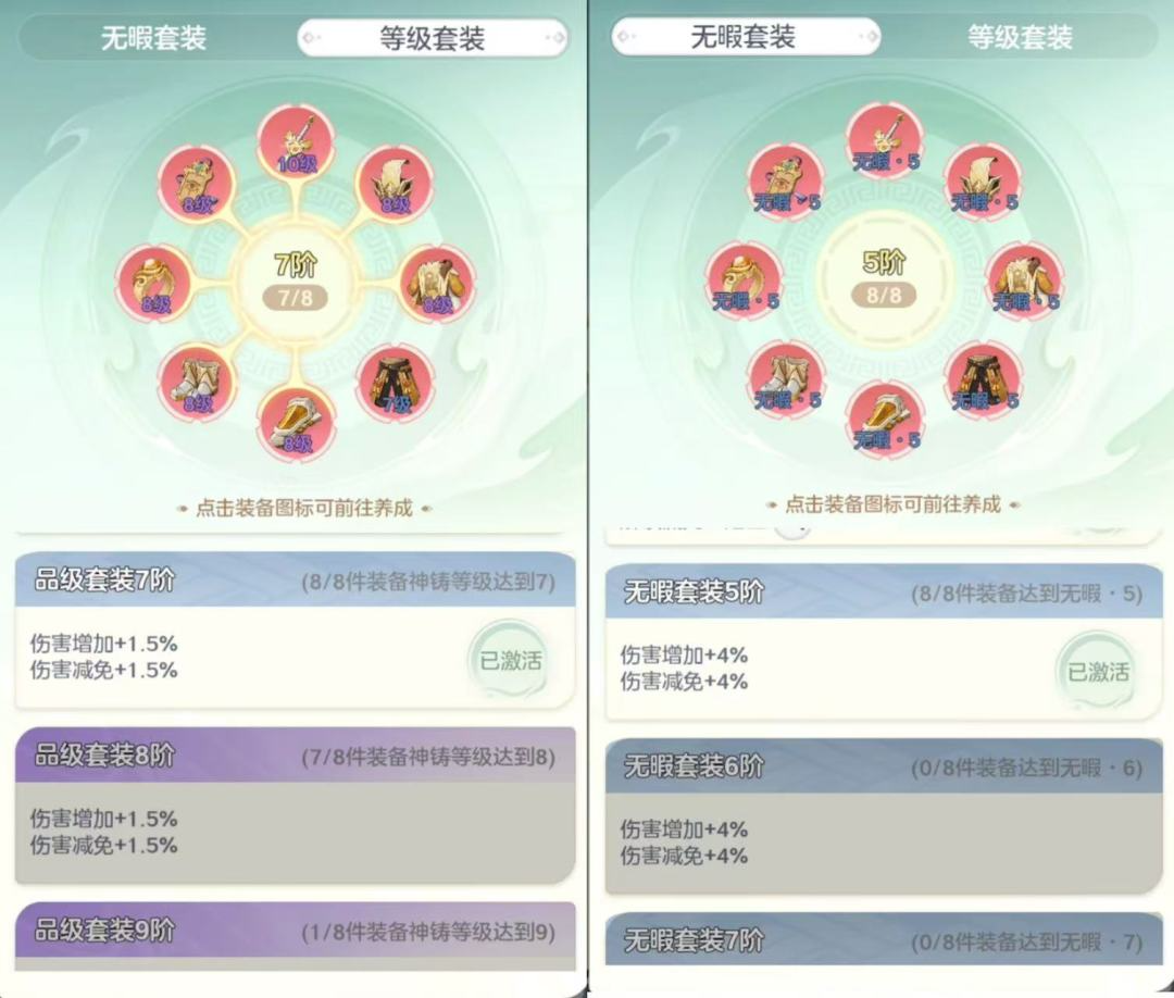 很多玩家不清楚分等级套装(固定1.5%增伤减伤)和无暇套装(3%-5%伤害,需≥90%强化进度解锁)之间的优先级。每级神铸满进度可加4%属性。建议先升神铸等级,再补无暇品质:神铸4级补无暇2级,神铸7级补无暇4级。注意,无暇的伤害效果是等级加成的2倍以上,值得优先满足触发条件。